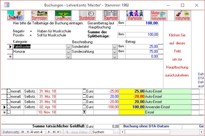 In diesem Fall öffnet sich (nachdem Sie die Returntaste gedrückt haben) das Splitformular. Tragen Sie die Einzelbeträge der Buchung ein, und klicken Sie anschließend auf das Feld –zur Hauptbuchung zurück gehen–.