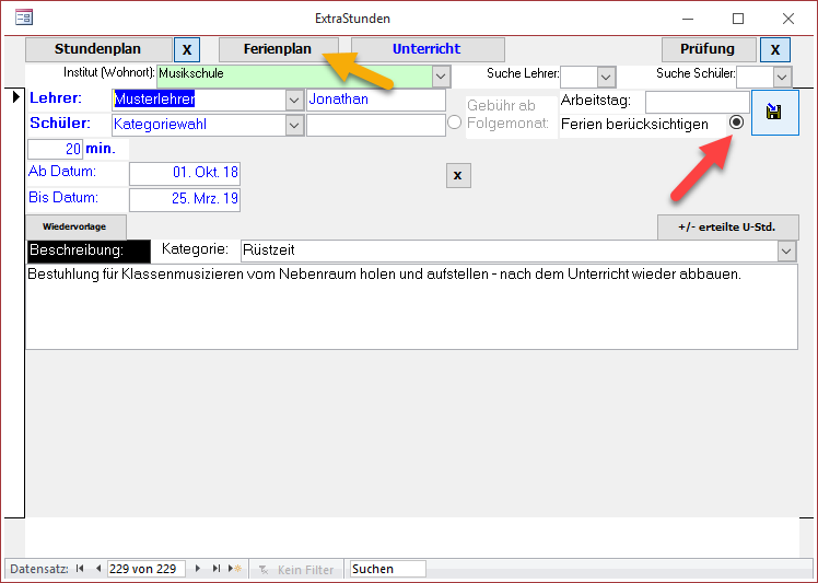 Normalerweise wird eine sich wiederholende Tätigkeit des Lehrers nicht in den Ferien ausgeübt. Deshalb ist die Option –Ferien berücksichtigen– integriert.