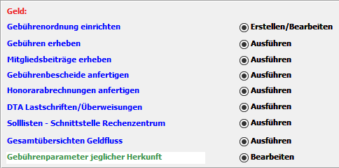 Der Benutzer kann alle Gebührenparameter lesen, jedoch nur diie Gebührenparameter bearbeiten, zu welcher Herkunft er das Recht Erstellen/Bearbeiten besitzt.