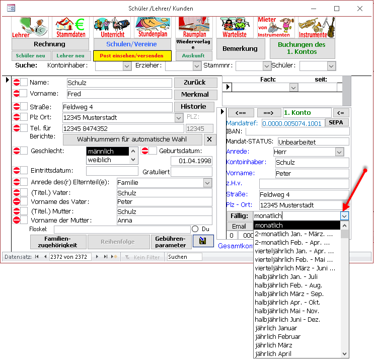 Über die Auswahlliste (roter Pfeil) stellen Sie die Fälligkeit des Kontos ein.