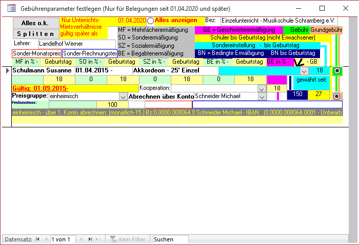 Weiter können hier neben der automatischen Mehrfächer- oder Geschwisterermäßigung auch weitere Ermäßigungen (beispielsweise Sozial- oder Begabtenermäßigung) eingestellt werden.