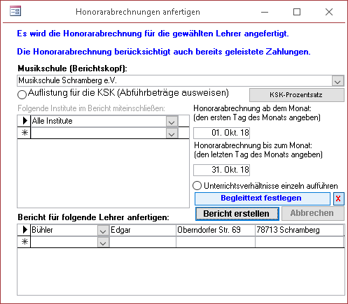 Honorarabrechnungen können auch für nur bestimmte Zweigstellen oder bestimmte Lehrer angefertigt werden. Der Honorarabrechnung können Begleittexte mitgegeben werden - es können beliebig viele Text vorgehalten und dann ja nach Bedarf abgerufen werden.