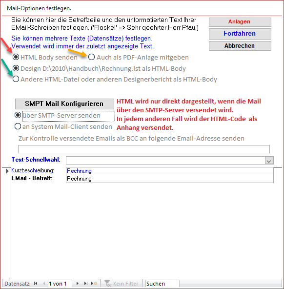 Beachten Sie, dass der Inhalt von HTML-Mails nur dann direkt beim Empfänger angezeigt werden kann, wenn Sie direkt über den SMTP-Server senden. Ansonsten wir der HTML-Code als Anlage versendet.