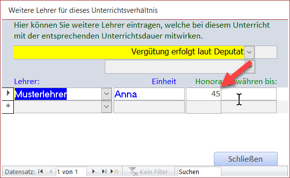 Zusätzliche Lehrer werden entsprechend der hinterlegten Einheit (s. roter Pfeil) beim Deputat oder der Honorarabrechnung berücksichtigt.