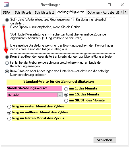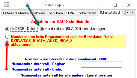 Um Neuanlagen/Änderungen von Bankverbindungen über die SAP-Schnittstelle zu übertragen muss die Option 'Änderungen in Verbindung mit DSDE-Datei (Export)' (roter Pfeil) aktiviert sein.