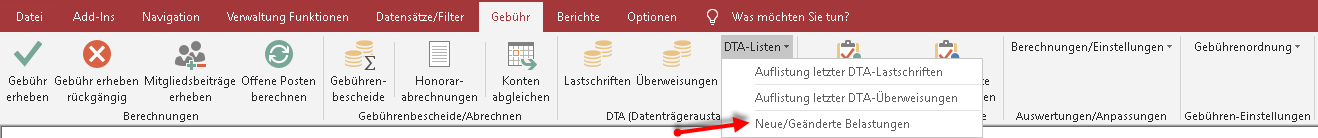 Hinweis: Diese Funktion entspricht dem Befehl 'SAP/Rechenzentrum Schnittstelle' - 'Neue/Geänderte Belastungen' bei Anwendung der Soll-Liste über 'regelmäßig wiederkehrende Einnahmen', arbeitet jedoch völlig unabhängig davon. Beide Funktionen werden völlig getrennt verwaltet.