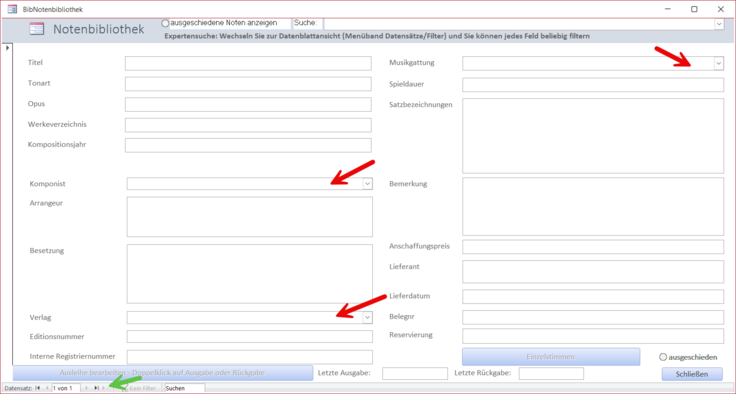 Füllen Sie alle Informationen zu den Noten aus, welche Ihnen bekannt sind. Je mehr Informationen Sie erfassen, desto besser können Sie später bestimmte Noten finden. Haben Sie ein Datenblatt ausgefüllt, gehen Sie zu einem neuen Datensatz (grüner Pfeil) und erfassen die nächsten Noten.