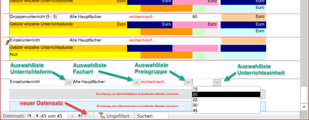 Im einfachsten Fall füllen Sie nur die 3. Priorität aus. Damit wird für alle Fächer einer Unterrichtsform derselbe Preis angewendet, und Sie brauchen den Preis für jede Unterrichtsform nur einmal eintragen. In Priorität 3 werden alle Datensätze vorbelegt, und Sie müssen nur noch die Preise für jede Unterrichsform - Preisgruppe eintragen.