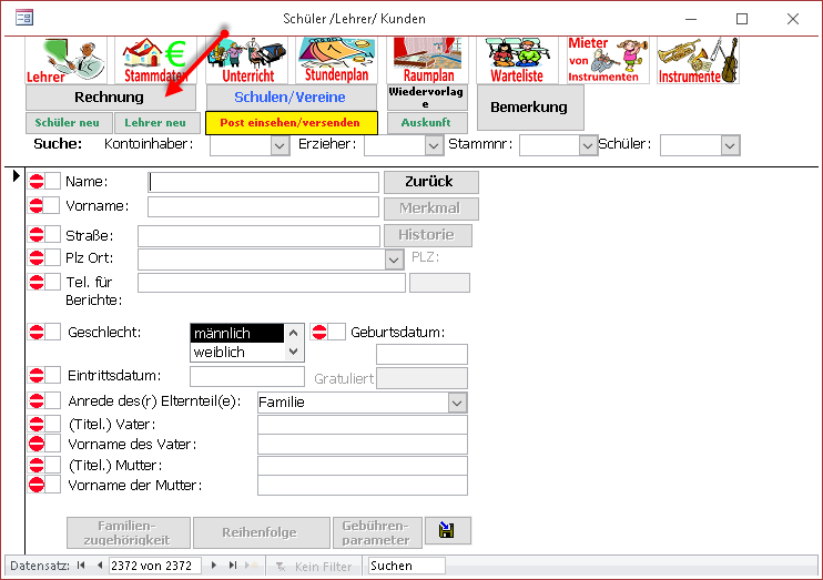 Mit diesem Schaltbutton wird eine Rechnung für das aktuelle Konto und den aktuellen Berechnungsmonat (Einstellung im Zentralformular Unterricht) geschrieben.