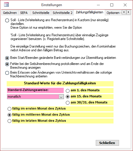 Im Register Zahlungsfälligkeiten können Sie Standardwerte für Zahlungsfälligkeiten festlegen und weitere Einstellungen zur Gebührenberechnung machen.