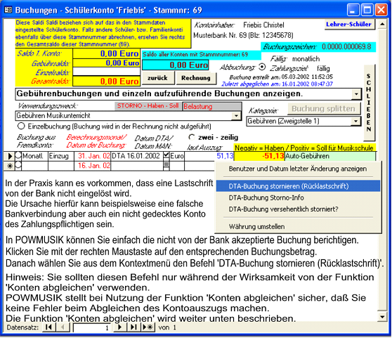 Rücklastschriften (von der Bank nicht akzeptierte Lastschriften) - rechte Maustaste auf die betroffene Buchung - DTA-Buchung stornieren (Rücklastschrift)