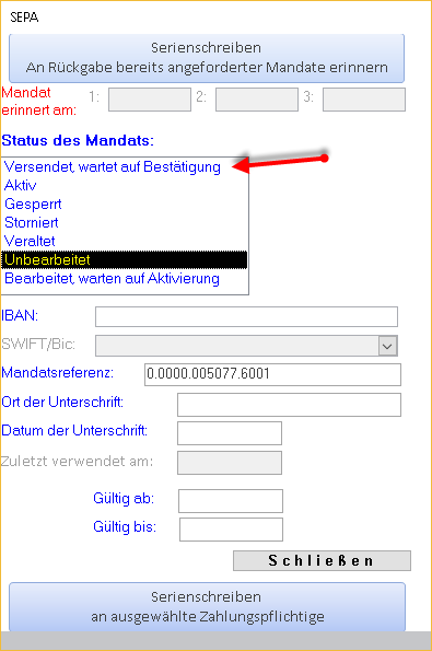 Wählen Sie in der Liste 'Status des Mandats' den Eintrag 'Versendet, wartet auf Bestätigung'.