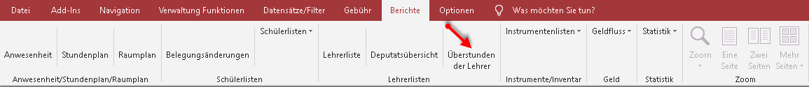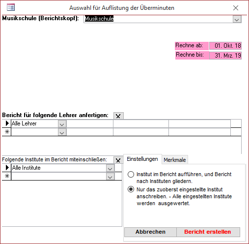 Mit diesem Menüpunkt drucken Sie einen Bericht, der alle eingetragenen Aktivitäten von jedem beliebigen Lehrer über den von Ihnen festgelegten Zeitraum auflistet, die außerhalb seines festgelegten Deputats liegen.