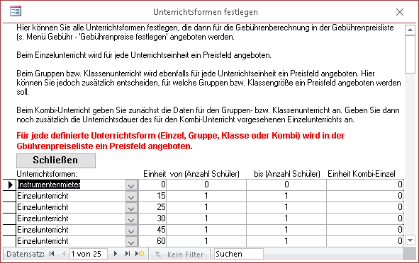 Stellen Sie alle an Ihrer Musikschule angebotenen Unterrichtsformen ein.