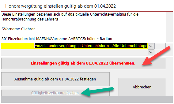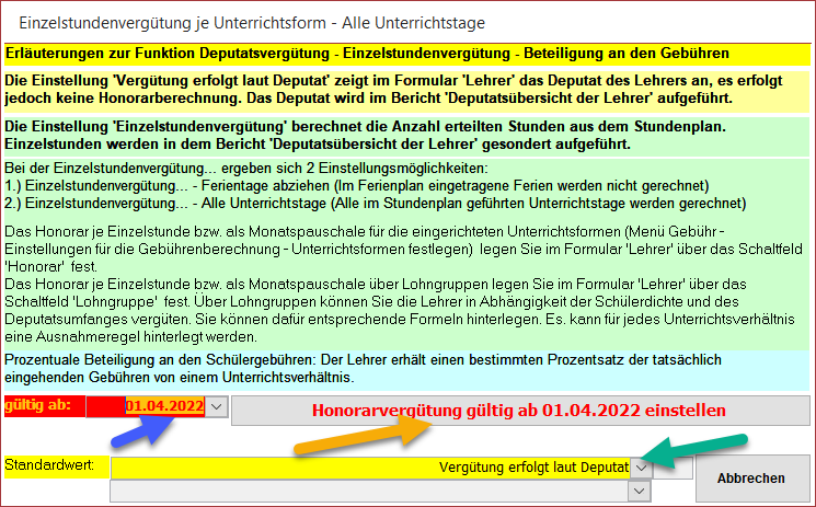 Übrigens: Über die Auswahlliste (grüner Pfeil) können Sie für den aktuellen Lehrer den Standardwert für die Vergütung einstellen, welcher dann beim Erfassen neuer Unterrichte automatisch eingestellt wird.