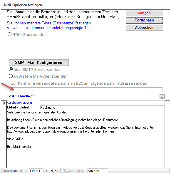 Der zuletzt genannte Nachteil kann insofern abgefangen werden, dass Sie eine extra Email-Adresse für ihre mit POWMUSIK gesendete Post einrichten, und dann diese Email-Adresse als BCC eintragen (roter Pfeil).