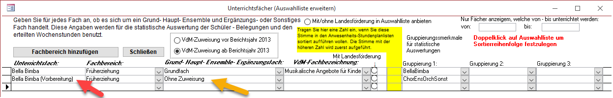 Man muss zuvor in der Unterrichtsfachauswahlliste ein Fach anzulegen, welches die zusätzliche Tätigkeit des Lehrers beschreibt (roter Pfeil).