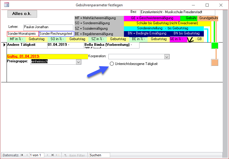 Beim Öffnen der Gebührenparameter (grüner Pfeil) einer 'Anderen Tätigkeit' erhält man eine Gesamtliste aller eingetragenen Tätigkeiten und kann dort gesammelt festlegen, bei welche Tätigkeiten es sich um unterrichtsbezogene Tätigkeiten handelt.