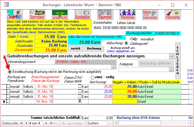 Wenn die gewünschte Buchungsart (Gebührenbuchung oder Einzelbuchung) falsch voreingestellt ist - Sie ersehen jedem Datensatz am rechten Rand, ob es sich um eine Gebühren oder Einzelbuchung handelt - klicken Sie auf die Option – Einzelbuchung (Buchung wird in der Rechnung nicht aufgeführt)– im Formularkopf um die Buchungsart zu ändern. Ein neuer Datensatz wird angelegt, und das Feld –Verwendungszweck– erhält den Fokus.