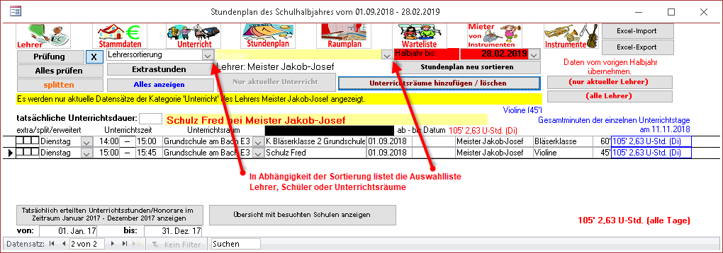 Sie können den Stundenplan für jeden eingetragenen Lehrer einblenden, indem Sie den Pfeil oben im Formular rechts über dem Lehrernamen anklicken.