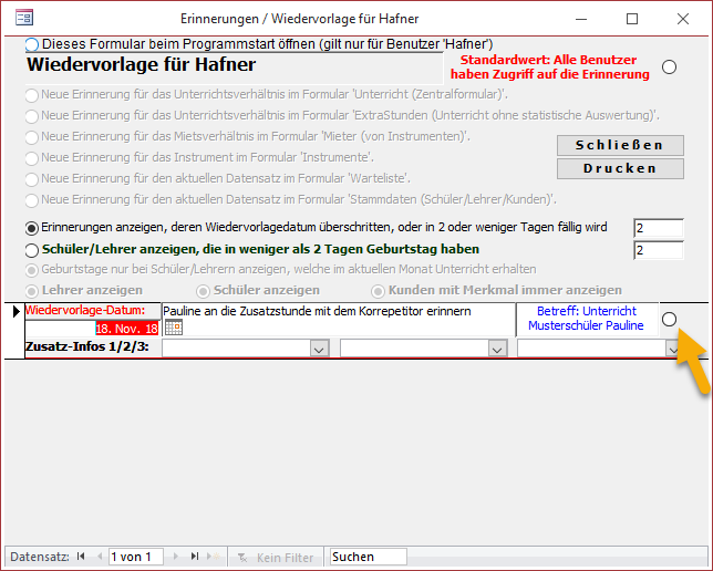 Wiedervorlagen können in den Formularen Stammdaten, Unterricht, Extrastunden, Mieter, Instrumente und in der Warteliste eingerichtet werden.